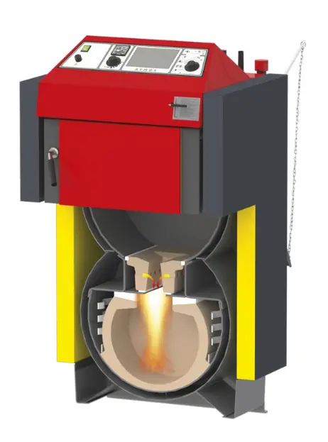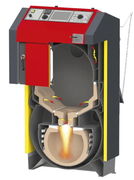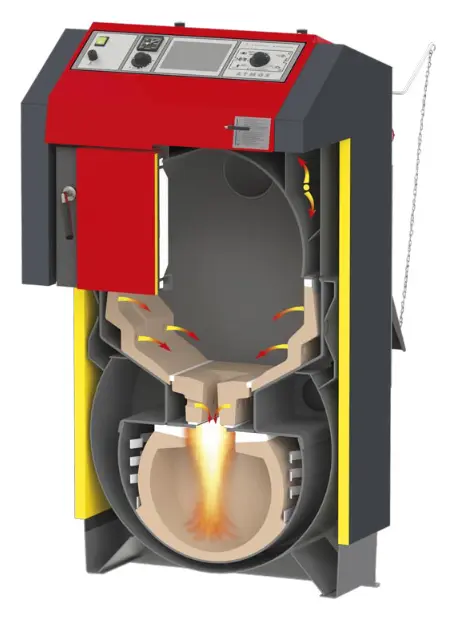 To nie jest zwykły kocioł zasypowy. Drewno najpierw ulega kontrolowanemu zgazowaniu, a powstały gaz drzewny dopalany jest w ceramicznej komorze w temperaturze 1000–1200°C.